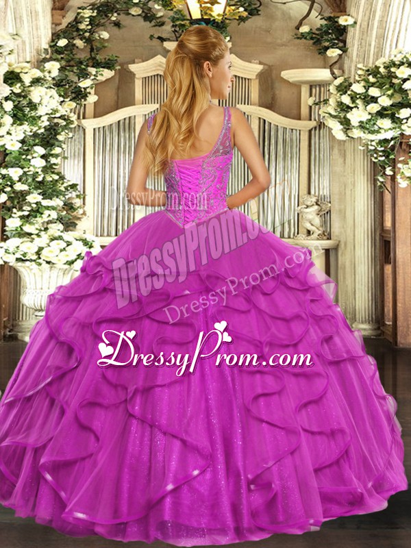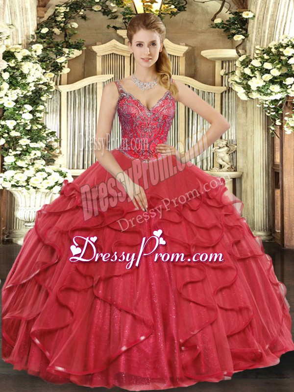 Neckline : V-neckShown Color : Wine RedSilhouette : Ball GownsSleeve Length : sleevelessHemline : floor lengthBack Detail : Lace upFabric : TulleEmbellishment : Beading,RufflesOccasion : Military Ball,Sweet 16,QuinceaneraSeason : Spring,Summer,Fall,Winter
