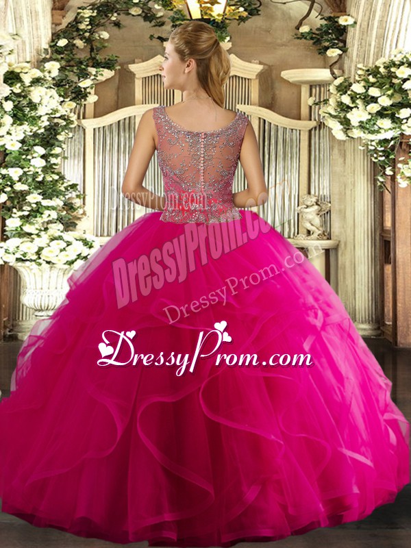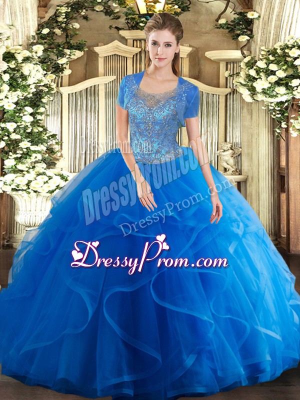 Neckline : ScoopShown Color : Royal BlueSilhouette : Ball GownsSleeve Length : sleevelessHemline : floor lengthBack Detail : Clasp handleFabric : TulleEmbellishment : Beading,RufflesOccasion : Military Ball,Sweet 16,QuinceaneraSeason : Spring,Summer,Fall,Winter