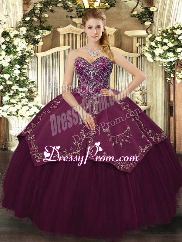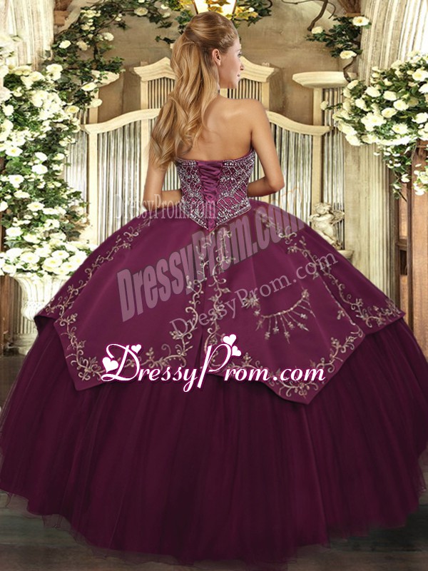 Neckline : SweetheartShown Color : BurgundySilhouette : Ball GownsSleeve Length : sleevelessHemline : floor lengthBack Detail : Lace upFabric : Taffeta,TulleEmbellishment : Beading,PatternOccasion : Military Ball,Sweet 16,QuinceaneraSeason : Spring,Summer,Fall,Winter