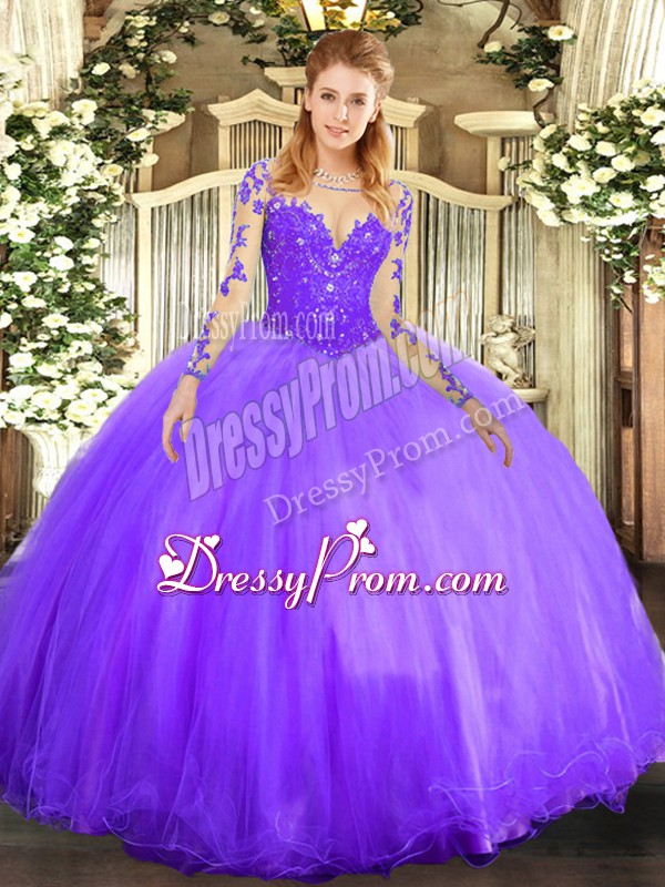 Neckline : ScoopShown Color : LavenderSilhouette : Ball GownsSleeve Length : long sleevesHemline : floor lengthBack Detail : Lace upFabric : TulleEmbellishment : LaceOccasion : Military Ball,Sweet 16,QuinceaneraSeason : Spring,Summer,Fall,Winter