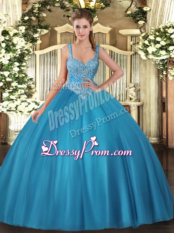 Neckline : StrapsShown Color : Teal Silhouette : Ball GownsSleeve Length : sleevelessHemline : floor lengthBack Detail : Lace upFabric : TulleEmbellishment : BeadingOccasion : Military Ball,Sweet 16,QuinceaneraSeason : Spring,Summer,Fall,Winter