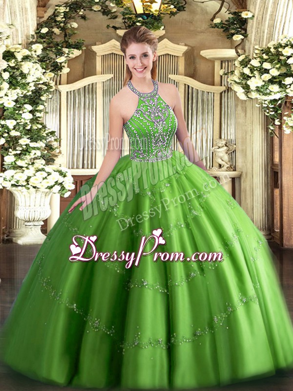 Neckline : Halter top Shown Color : Spring Green Silhouette : Ball Gowns Sleeve Length : sleeveless Hemline : floor length Back Detail : Lace up Fabric : Tulle Embellishment : Beading,Appliques Occasion : Military Ball,Sweet 16,Quinceanera Season : Spring,Summer,Fall,Winter