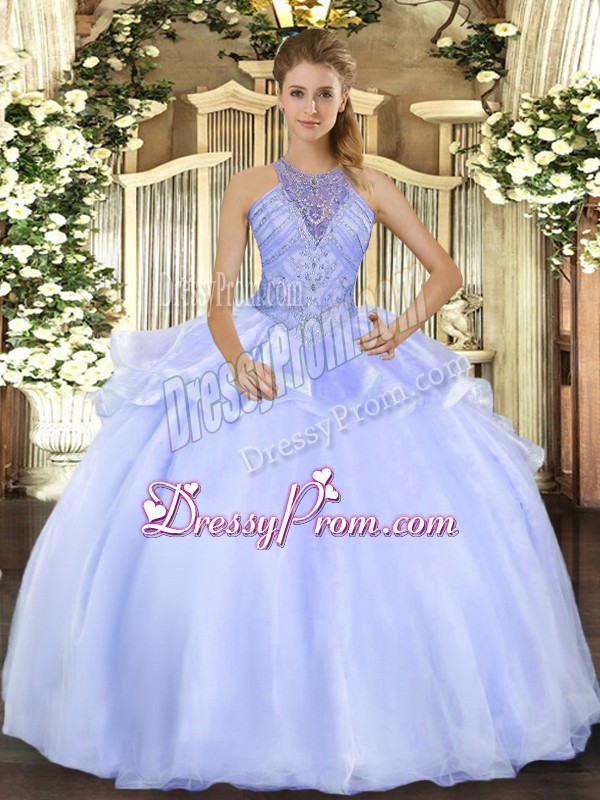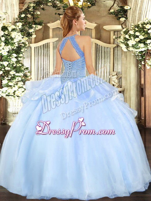 Neckline : Halter topShown Color : BlueSilhouette : Ball GownsSleeve Length : sleevelessHemline : floor lengthBack Detail : Lace upFabric : OrganzaEmbellishment : BeadingOccasion : Military Ball,Sweet 16,QuinceaneraSeason : Spring,Summer,Fall,Winter