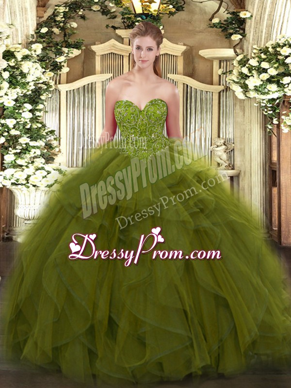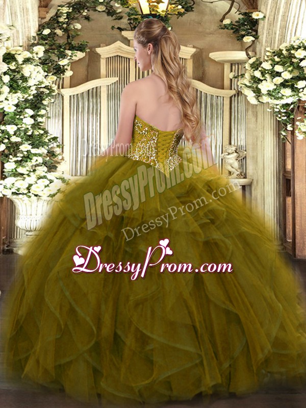 Neckline : SweetheartShown Color : Olive GreenSilhouette : Ball GownsSleeve Length : sleevelessHemline : floor lengthBack Detail : Lace upFabric : TulleEmbellishment : BeadingOccasion : Military Ball,Sweet 16,QuinceaneraSeason : Spring,Summer,Fall,Winter