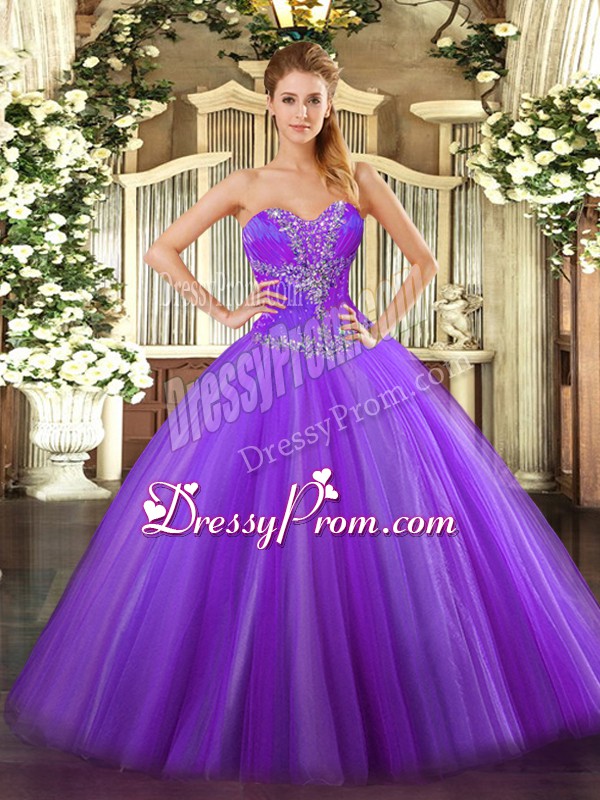 Neckline : SweetheartShown Color : Eggplant PurpleSilhouette : Ball GownsSleeve Length : sleevelessHemline : floor lengthBack Detail : Lace upFabric : TulleEmbellishment : BeadingOccasion : Sweet 16,QuinceaneraSeason : Spring,Summer,Fall,Winter