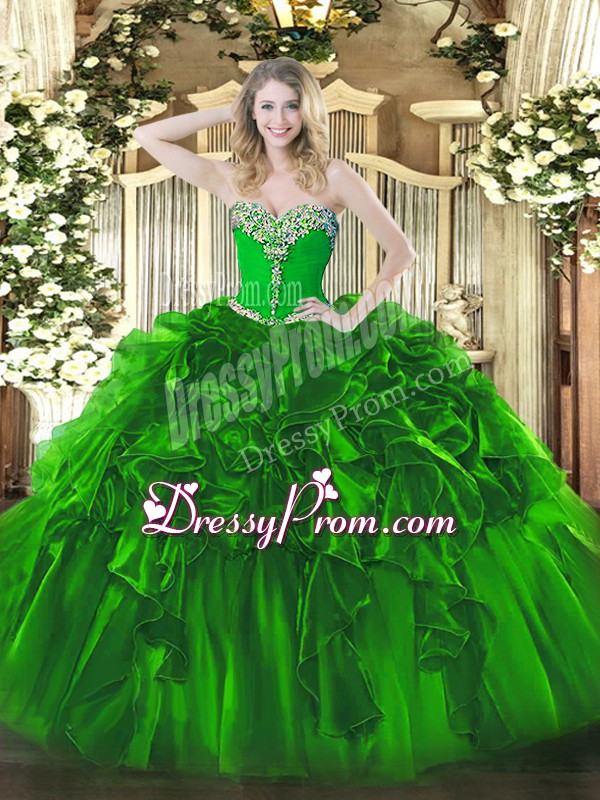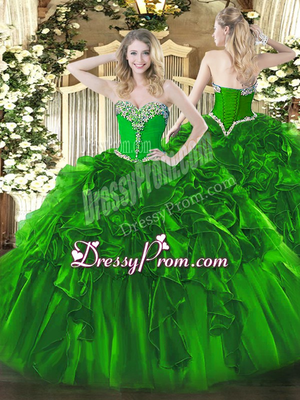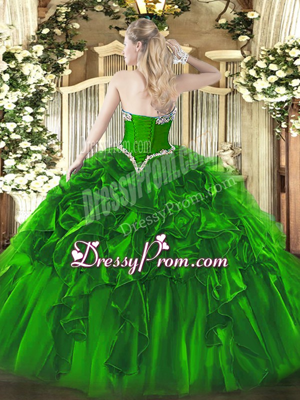 Neckline : SweetheartShown Color : GreenSilhouette : Ball GownsSleeve Length : sleevelessHemline : floor lengthBack Detail : Lace upFabric : OrganzaEmbellishment : Beading,RufflesOccasion : Military Ball,Sweet 16,QuinceaneraSeason : Spring,Summer,Fall,Winter