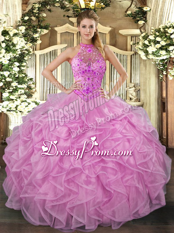 Neckline : Halter topShown Color : LilacSilhouette : Ball GownsSleeve Length : sleevelessHemline : floor lengthBack Detail : Lace upFabric : OrganzaEmbellishment : Beading,Embroidery,RufflesOccasion : Sweet 16,QuinceaneraSeason : Spring,Summer,Fall,Winter