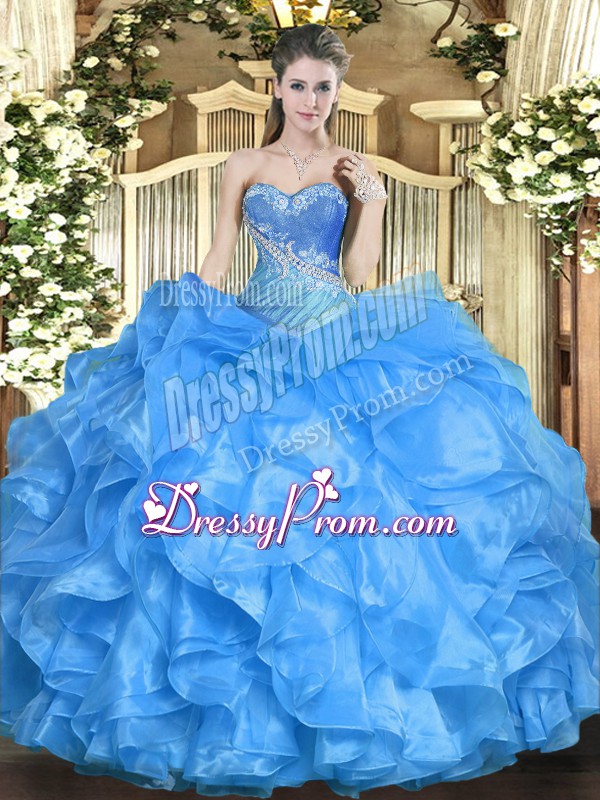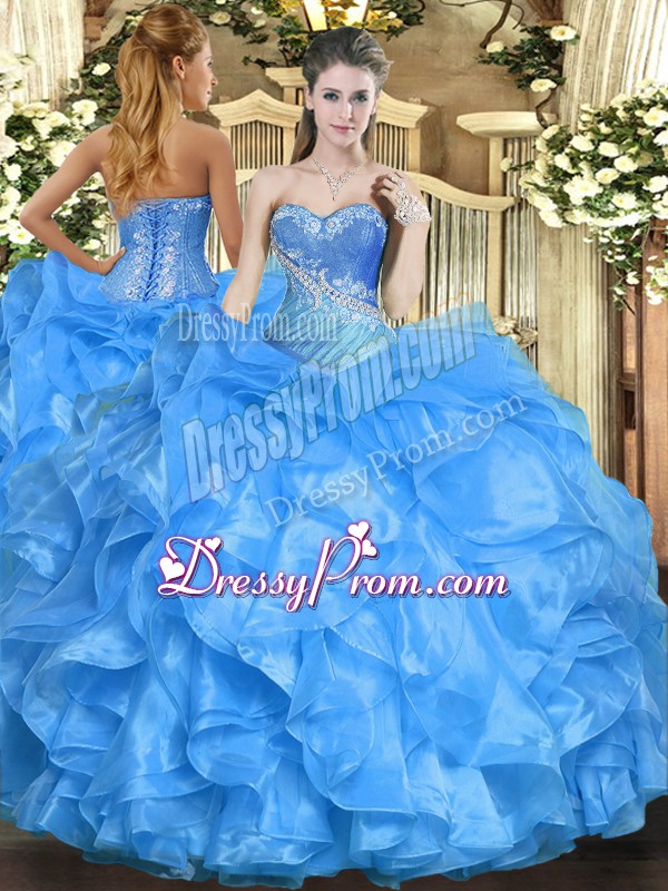 Baby Blue Organza Lace Up Sweet 16 Dress Sleeveless Floor Length Beading and Ruffles