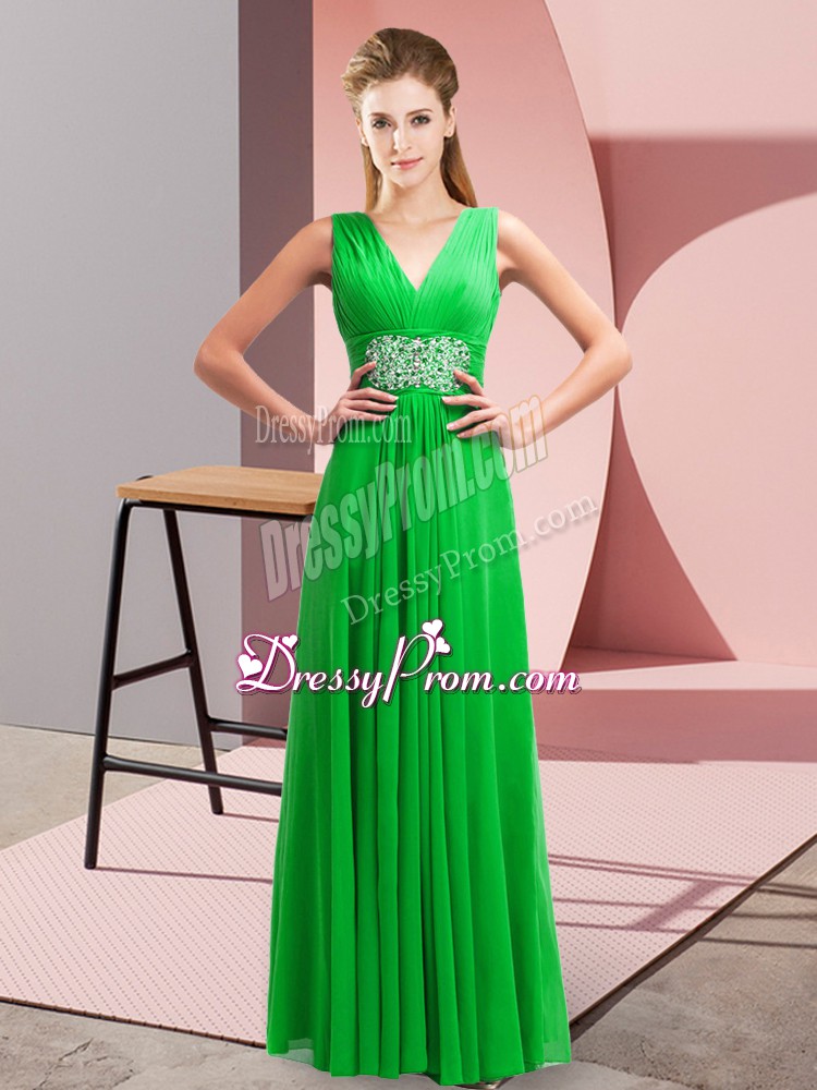 Neckline : V-neckShown Color : GreenSilhouette : EmpireSleeve Length : sleevelessHemline : floor lengthBack Detail : Side zipperFabric : ChiffonEmbellishment : Beading,RuchingOccasion : Prom,PartySeason : Spring,Summer,Fall