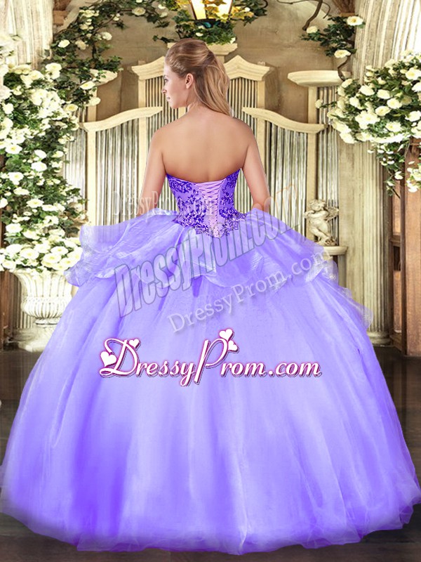 Neckline : SweetheartShown Color : LavenderSilhouette : Ball GownsSleeve Length : sleevelessHemline : floor lengthBack Detail : Lace upFabric : OrganzaEmbellishment : AppliquesOccasion : Sweet 16,QuinceaneraSeason : Spring,Summer,Fall,Winter