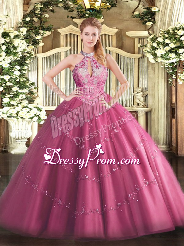 Neckline : Halter topShown Color : Hot PinkSilhouette : Ball GownsSleeve Length : sleevelessHemline : floor lengthBack Detail : Lace upFabric : TulleEmbellishment : Lace,AppliquesOccasion : Military Ball,Sweet 16,QuinceaneraSeason : Spring,Summer,Fall,Winter