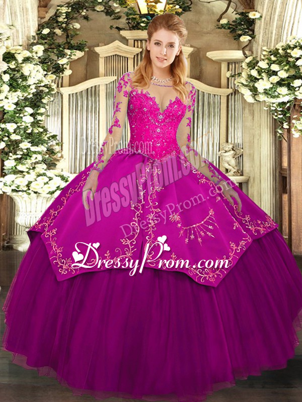 Neckline : ScoopShown Color : FuchsiaSilhouette : Ball GownsSleeve Length : long sleevesHemline : floor lengthBack Detail : Lace upFabric : Organza,TaffetaEmbellishment : Lace,EmbroideryOccasion : Military Ball,Sweet 16,QuinceaneraSeason : Spring,Summer,Fall,Winter