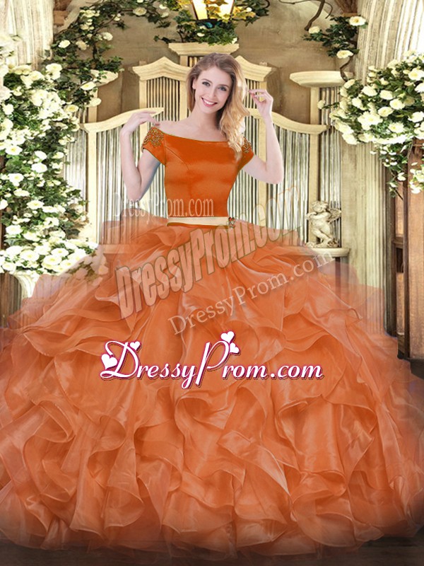 Affordable Two Pieces Quince Ball Gowns Orange Red Off The Shoulder Organza Short Sleeves Floor Length Zipper