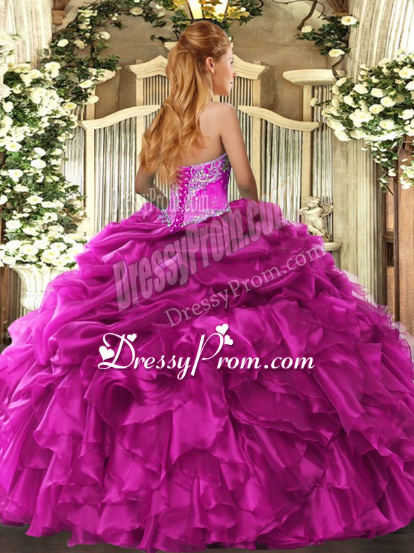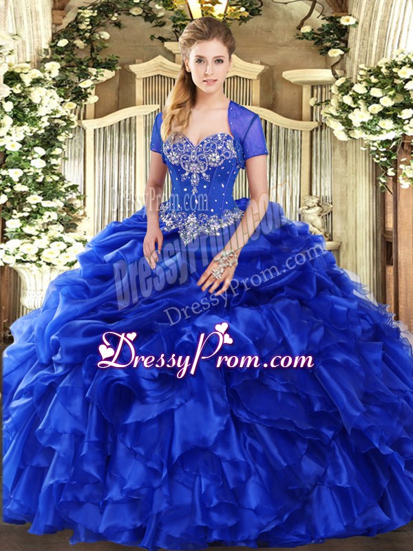 Neckline : SweetheartShown Color : Royal BlueSilhouette : Ball GownsSleeve Length : sleevelessHemline : floor lengthBack Detail : Lace upFabric : OrganzaEmbellishment : Beading,Ruffles,Pick UpsOccasion : Military Ball,Sweet 16,QuinceaneraSeason : Spring,Summer,Fall,Winter