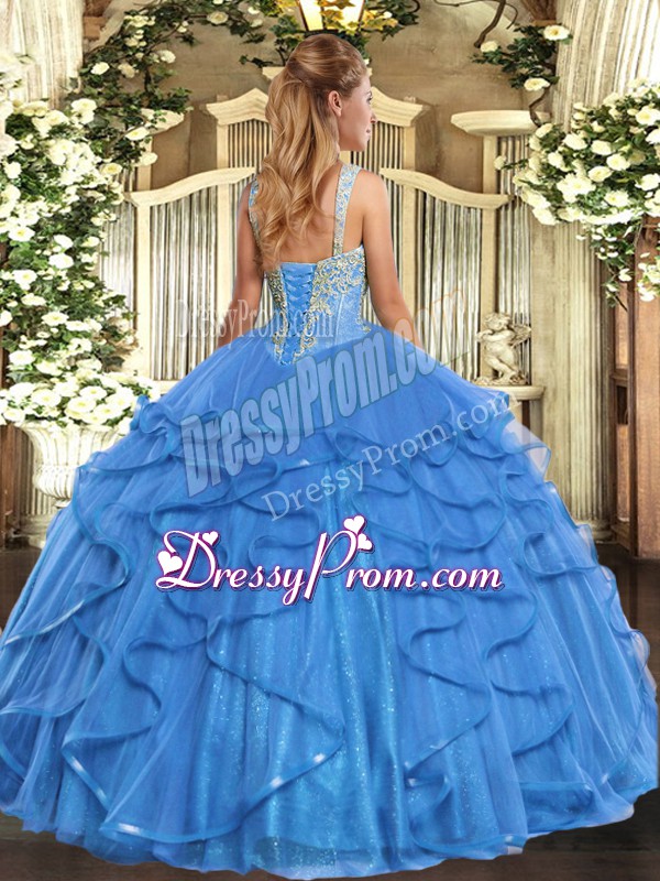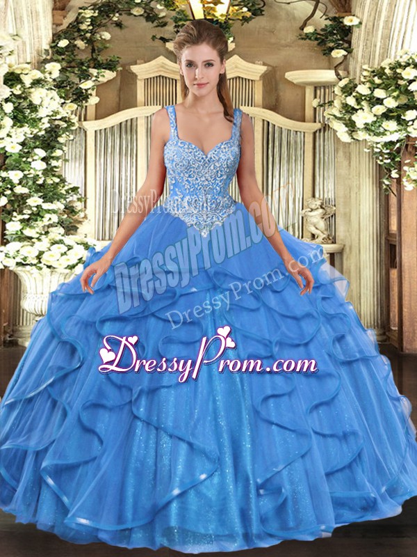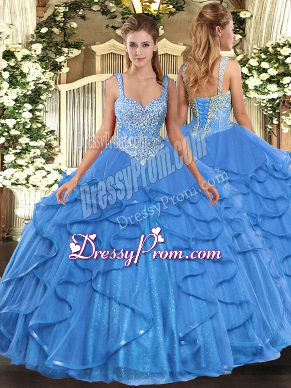 Neckline : StrapsShown Color : Baby BlueSilhouette : Ball GownsSleeve Length : sleevelessHemline : floor lengthBack Detail : Lace upFabric : TulleEmbellishment : Beading,RufflesOccasion : Military Ball,Sweet 16,QuinceaneraSeason : Spring,Summer,Fall,Winter