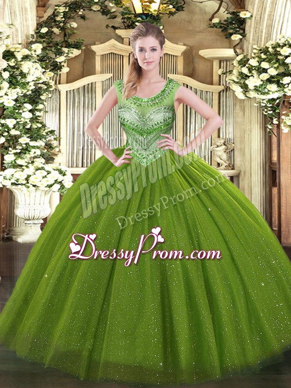 Neckline : ScoopShown Color : Olive GreenSilhouette : Ball GownsSleeve Length : sleevelessHemline : floor lengthBack Detail : Lace upFabric : Tulle,SequinedEmbellishment : BeadingOccasion : Sweet 16,QuinceaneraSeason : Spring,Summer,Fall,Winter
