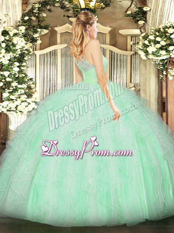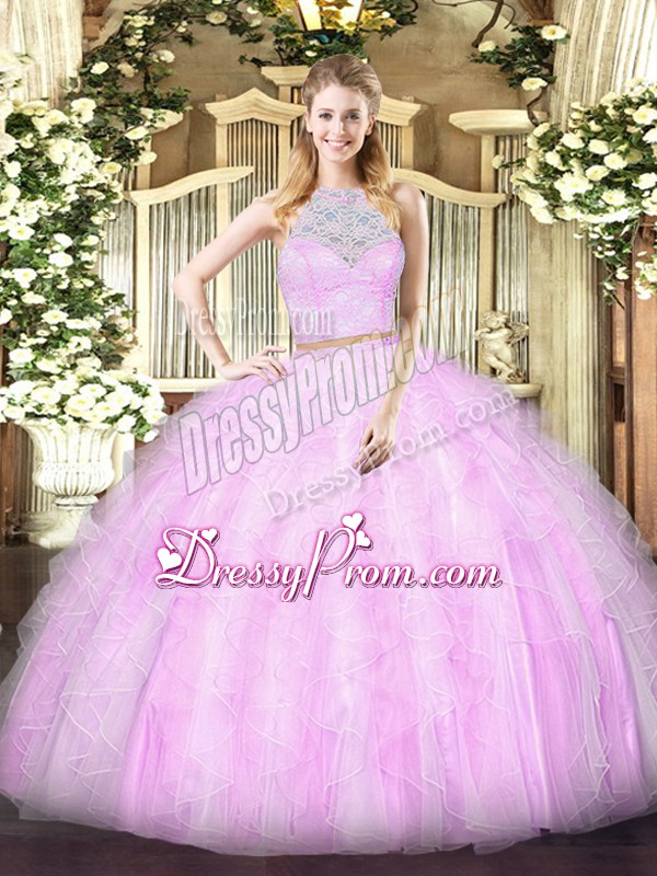 Neckline : ScoopShown Color : LilacSilhouette : Two PiecesSleeve Length : sleevelessHemline : floor lengthBack Detail : ZipperFabric : TulleEmbellishment : Lace,RufflesOccasion : Military Ball,Sweet 16,QuinceaneraSeason : Spring,Summer,Fall,Winter
