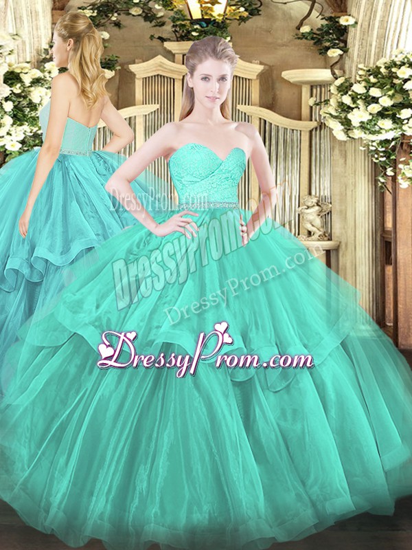 Neckline : SweetheartShown Color : TurquoiseSilhouette : Ball GownsSleeve Length : sleevelessBack Detail : ZipperFabric : TulleEmbellishment : Beading,Lace,Ruffled LayersOccasion : Military Ball,Sweet 16,QuinceaneraSeason : Spring,Summer,Fall,Winter