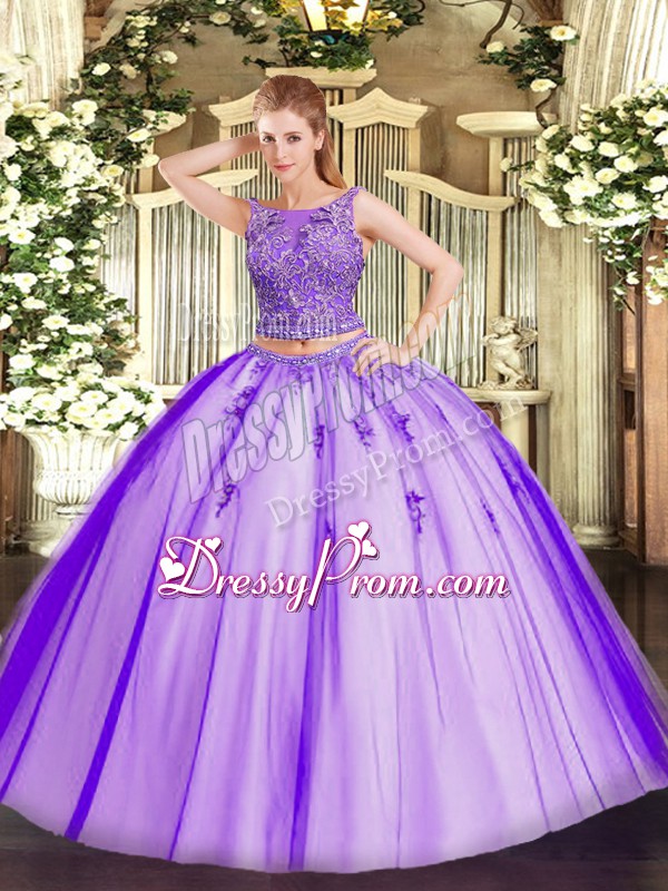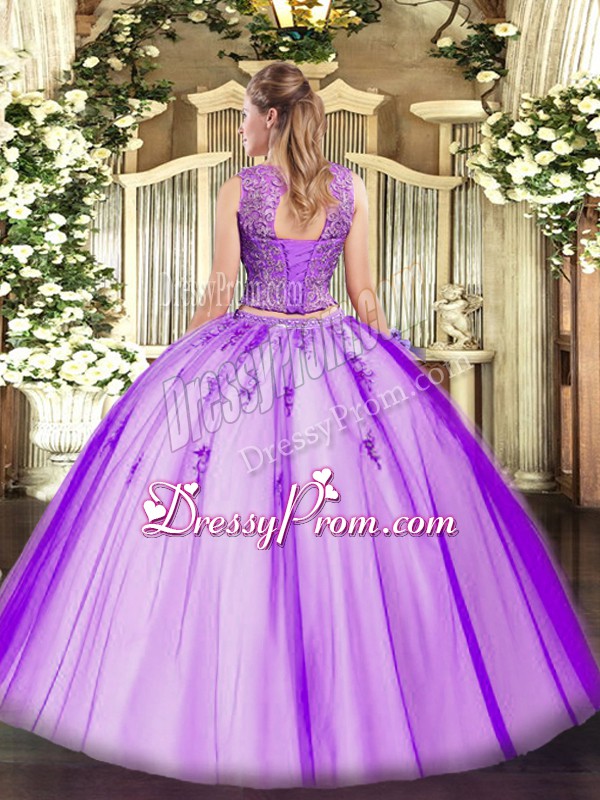 Neckline : ScoopShown Color : LavenderSilhouette : Two PiecesSleeve Length : sleevelessHemline : floor lengthBack Detail : Lace upFabric : TulleEmbellishment : Beading,AppliquesOccasion : Military Ball,Sweet 16,QuinceaneraSeason : Spring,Summer,Fall,Winter