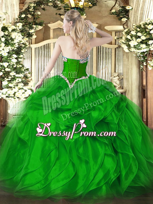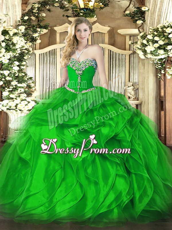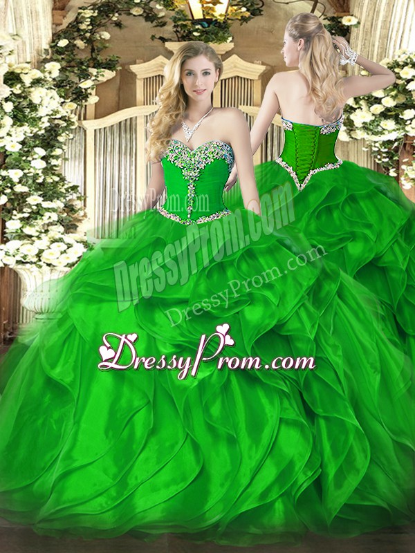 Neckline : SweetheartShown Color : GreenSilhouette : Ball GownsSleeve Length : sleevelessHemline : floor lengthBack Detail : Lace upFabric : OrganzaEmbellishment : Beading,RufflesOccasion : Military Ball,Sweet 16,QuinceaneraSeason : Spring,Summer,Fall,Winter