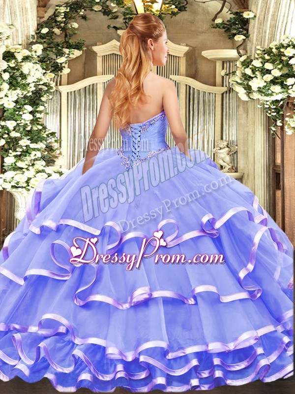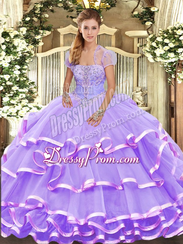 Neckline : StraplessShown Color : LavenderSilhouette : Ball GownsSleeve Length : sleevelessHemline : floor lengthBack Detail : Lace upFabric : OrganzaEmbellishment : Beading,Ruffled LayersOccasion : Military Ball,Sweet 16,QuinceaneraSeason : Spring,Summer,Fall,Winter