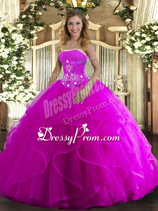 Neckline : StraplessShown Color : FuchsiaSilhouette : Ball GownsSleeve Length : sleevelessHemline : floor lengthBack Detail : Lace upFabric : TulleEmbellishment : Beading,RufflesOccasion : Military Ball,Sweet 16,QuinceaneraSeason : Spring,Summer,Fall,Winter