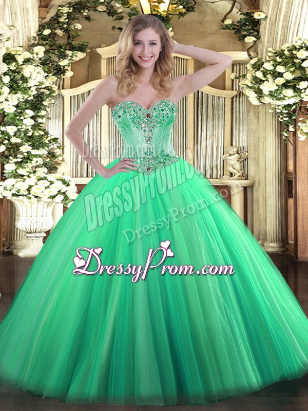 Neckline : SweetheartShown Color : TurquoiseSilhouette : Ball GownsSleeve Length : sleevelessHemline : floor lengthBack Detail : Lace upFabric : TulleEmbellishment : BeadingOccasion : Sweet 16,QuinceaneraSeason : Spring,Summer,Fall,Winter