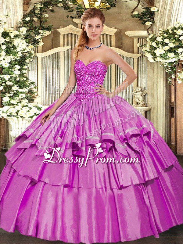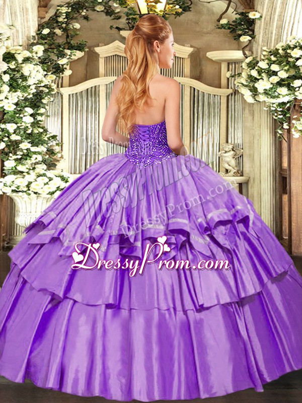 Neckline : SweetheartShown Color : LilacSilhouette : Ball GownsSleeve Length : sleevelessHemline : floor lengthBack Detail : Lace upFabric : Organza,TaffetaEmbellishment : Beading,Ruffled LayersOccasion : Military Ball,Sweet 16,QuinceaneraSeason : Spring,Summer,Fall,Winter