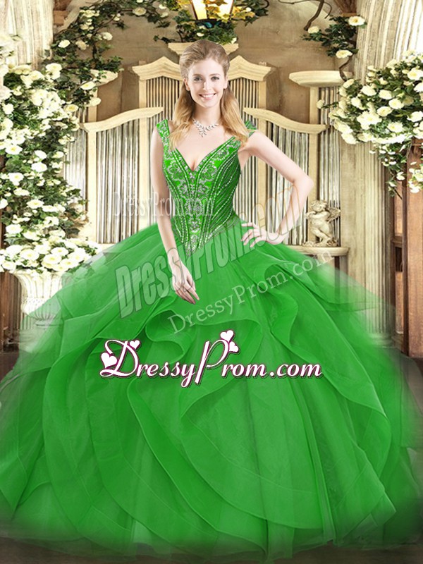 Neckline : V-neckShown Color : GreenSilhouette : Ball GownsSleeve Length : sleevelessHemline : floor lengthBack Detail : Lace upFabric : TulleEmbellishment : Beading,RufflesOccasion : Military Ball,Sweet 16,QuinceaneraSeason : Spring,Summer,Fall,Winter