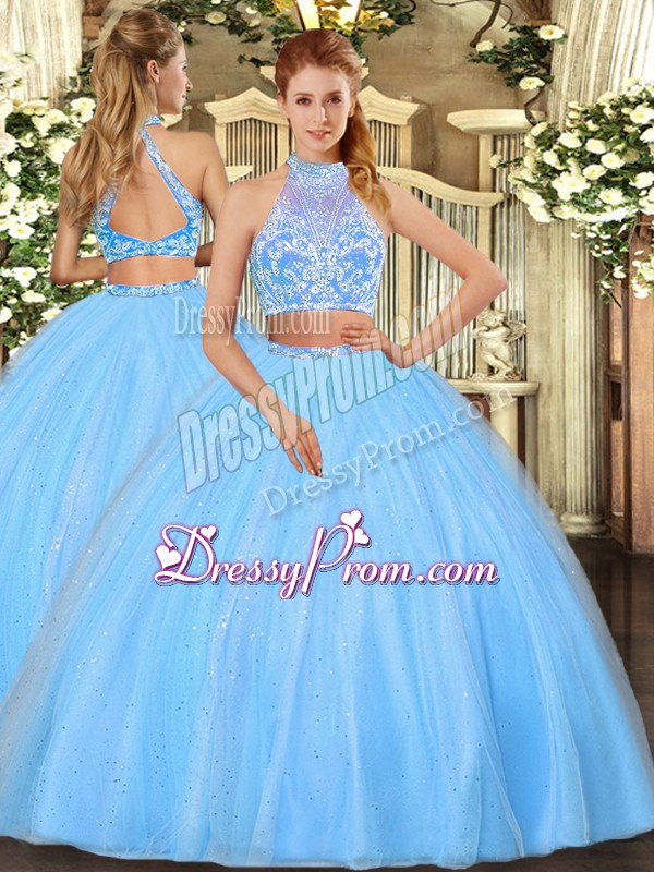 Neckline : Halter top Shown Color : Aqua Blue Silhouette : Two Pieces Sleeve Length : sleeveless Hemline : floor length Back Detail : Criss cross Fabric : Tulle Embellishment : Beading Occasion : Military Ball,Sweet 16,Quinceanera Season : Spring,Summer,Fall,Winter