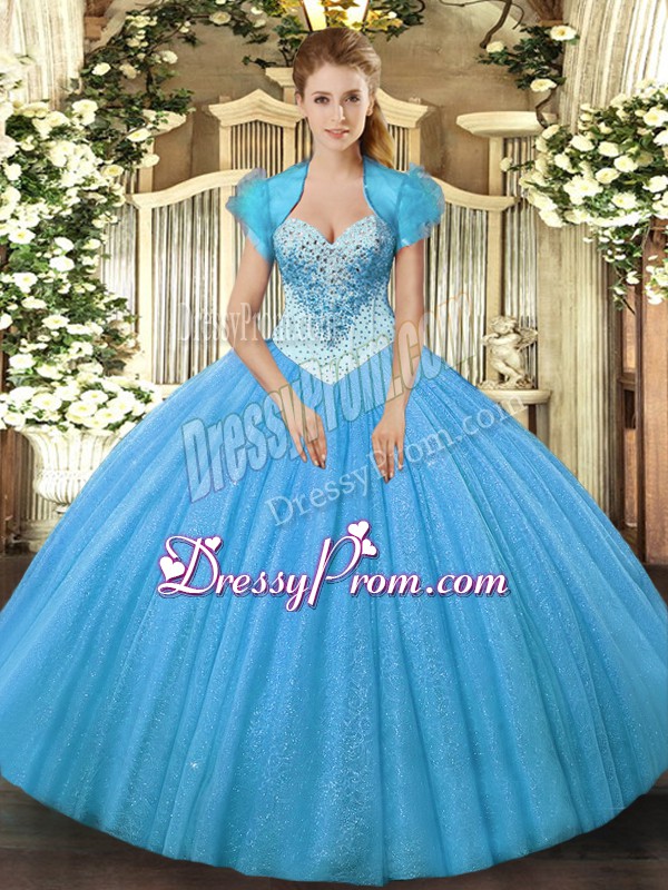 Neckline : SweetheartShown Color : Aqua BlueSilhouette : Ball GownsSleeve Length : sleevelessHemline : floor lengthBack Detail : Lace upFabric : TulleEmbellishment : BeadingOccasion : Military Ball,Sweet 16,QuinceaneraSeason : Spring,Summer,Fall,Winter