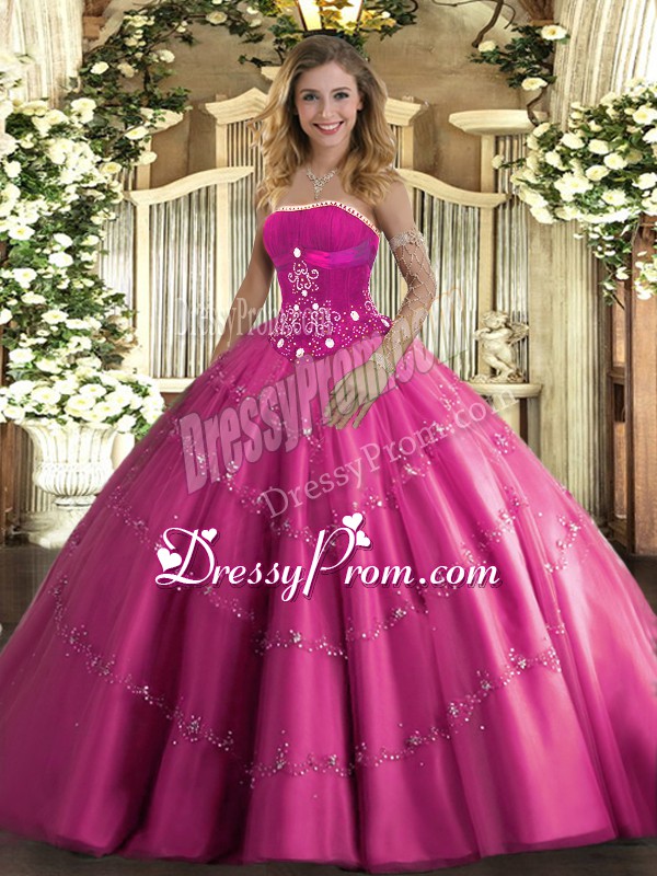 Neckline : StraplessShown Color : Hot PinkSilhouette : Ball GownsSleeve Length : sleevelessHemline : floor lengthBack Detail : Lace upFabric : TulleEmbellishment : Beading,AppliquesOccasion : Military Ball,Sweet 16,QuinceaneraSeason : Spring,Summer,Fall,Winter