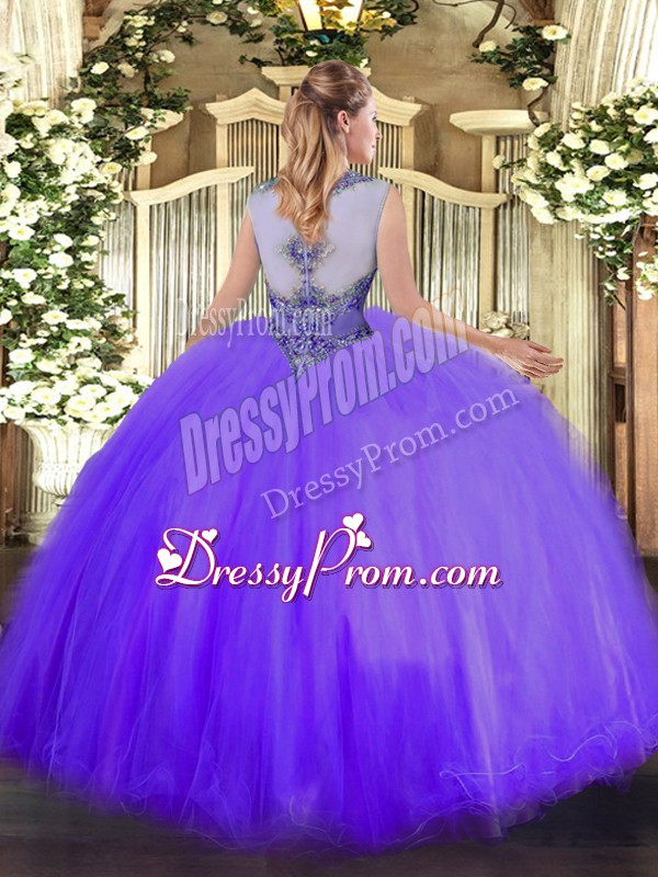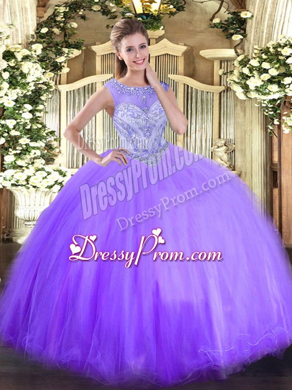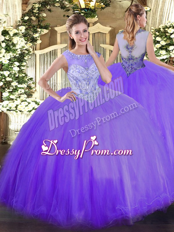 Neckline : ScoopShown Color : LavenderSilhouette : Ball GownsSleeve Length : sleevelessHemline : floor lengthBack Detail : ZipperFabric : TulleEmbellishment : BeadingOccasion : Sweet 16,QuinceaneraSeason : Spring,Summer,Fall,Winter