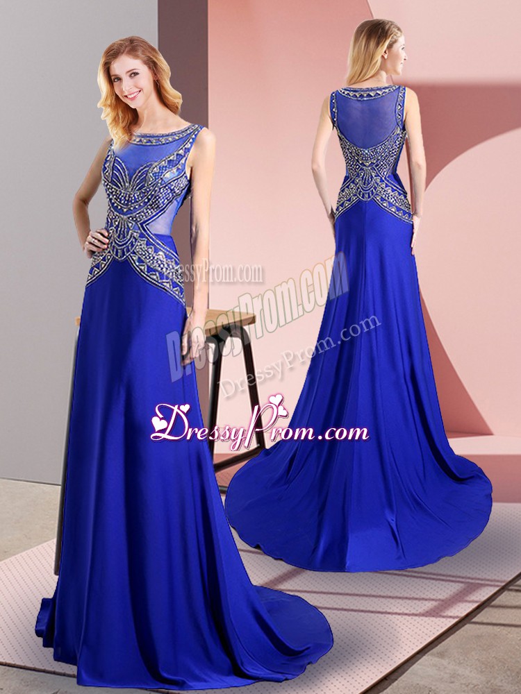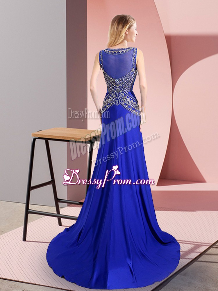 Neckline : ScoopShown Color : Royal BlueSilhouette : Column/SheathSleeve Length : sleevelessHemline : floor lengthBack Detail : Side zipperFabric : ChiffonEmbellishment : BeadingOccasion : Prom,PartySeason : Spring,Summer,Fall