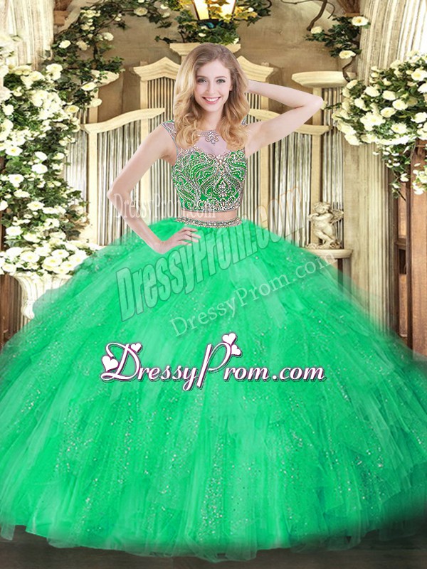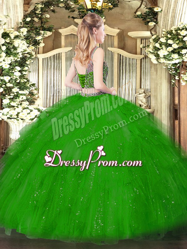 Neckline : ScoopShown Color : GreenSilhouette : Two PiecesSleeve Length : sleevelessHemline : floor lengthBack Detail : Lace upFabric : TulleEmbellishment : Beading,RufflesOccasion : Military Ball,Sweet 16,QuinceaneraSeason : Spring,Summer,Fall,Winter