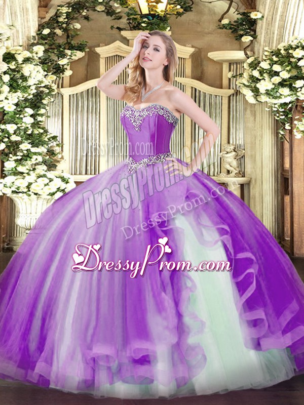 Neckline : SweetheartShown Color : LavenderSilhouette : Ball GownsSleeve Length : sleevelessHemline : floor lengthBack Detail : Lace upFabric : TulleEmbellishment : Beading,RufflesOccasion : Military Ball,Sweet 16,QuinceaneraSeason : Spring,Summer,Fall,Winter