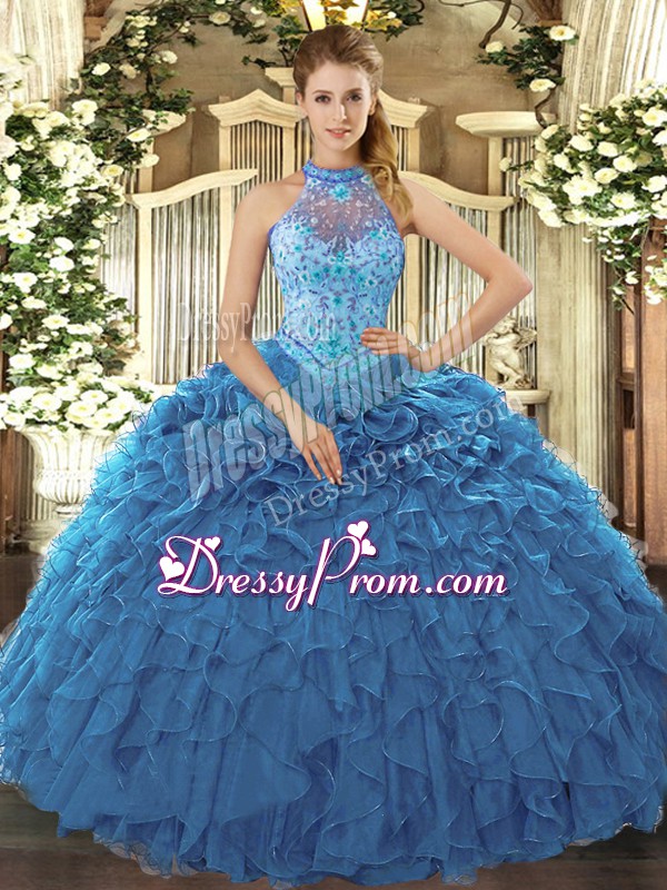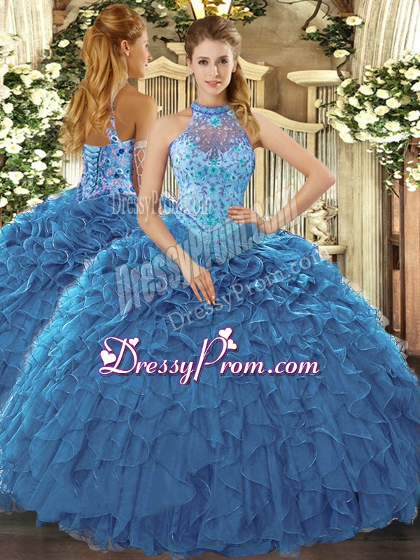 Neckline : Halter topShown Color : Teal Silhouette : Ball GownsSleeve Length : sleevelessHemline : floor lengthBack Detail : Lace upFabric : OrganzaEmbellishment : Beading,RufflesOccasion : Prom,Sweet 16,QuinceaneraSeason : Spring,Summer,Fall,Winter