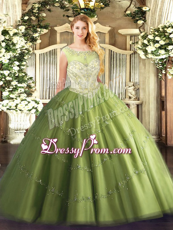 Neckline : ScoopShown Color : Olive GreenSilhouette : Ball GownsSleeve Length : cap sleevesHemline : floor lengthBack Detail : ZipperFabric : TulleEmbellishment : BeadingOccasion : Sweet 16,QuinceaneraSeason : Spring,Summer,Fall,Winter