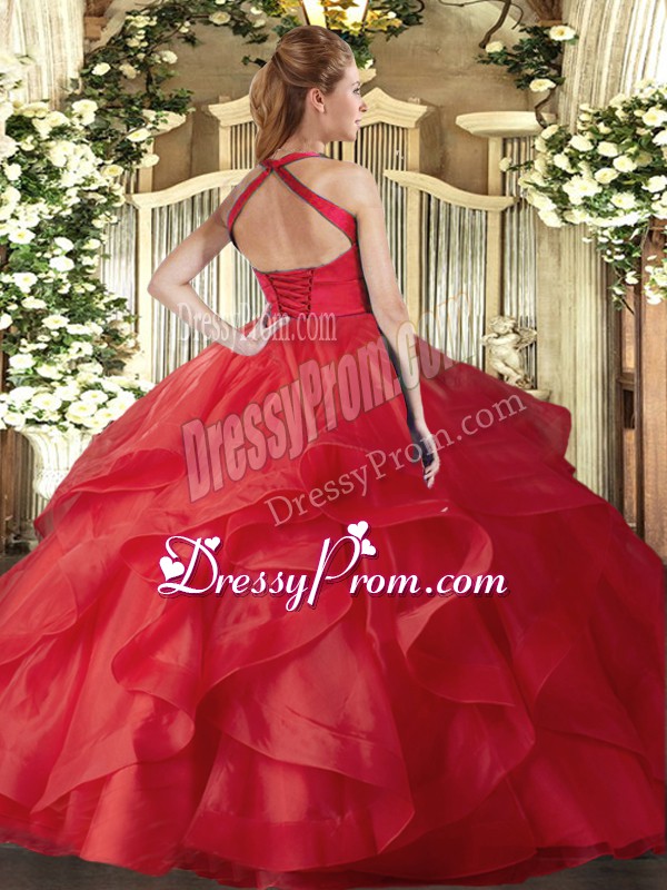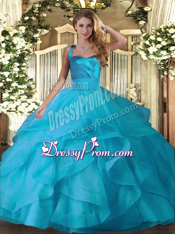 Neckline : Halter topShown Color : Baby BlueSilhouette : Ball GownsSleeve Length : sleevelessHemline : floor lengthBack Detail : Lace upFabric : TulleEmbellishment : RufflesOccasion : Military Ball,Sweet 16,QuinceaneraSeason : Spring,Summer,Fall,Winter