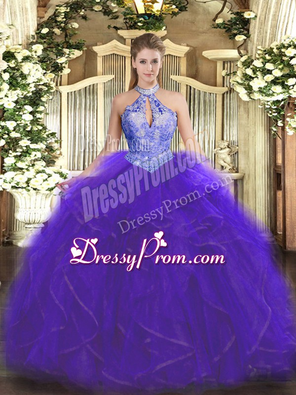 Neckline : Halter topShown Color : PurpleSilhouette : Ball GownsSleeve Length : sleevelessHemline : floor lengthBack Detail : Lace upFabric : OrganzaEmbellishment : Ruffles,SequinsOccasion : Military Ball,Sweet 16,Quinceanera