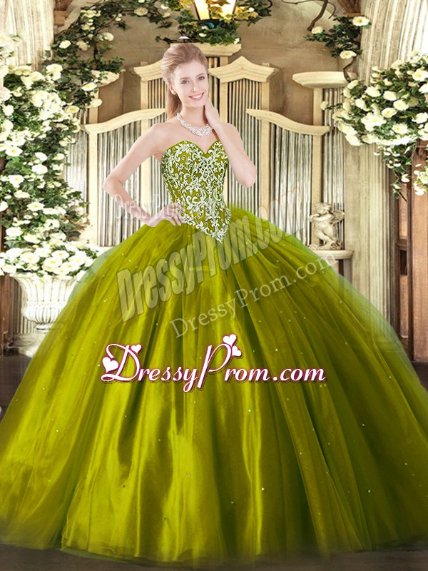 Neckline : SweetheartShown Color : Olive GreenSilhouette : Ball GownsSleeve Length : sleevelessHemline : floor lengthBack Detail : Lace upFabric : TulleEmbellishment : BeadingOccasion : Military Ball,Sweet 16,QuinceaneraSeason : Spring,Summer,Fall,Winter