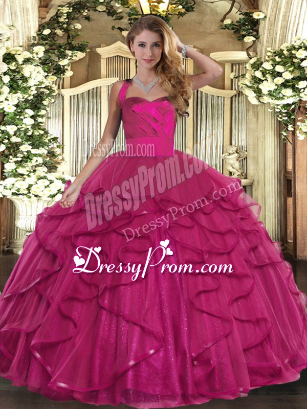Neckline : Halter topShown Color : FuchsiaSilhouette : Ball GownsSleeve Length : sleevelessHemline : floor lengthBack Detail : Lace upFabric : TulleEmbellishment : RufflesOccasion : Military Ball,Sweet 16,QuinceaneraSeason : Spring,Summer,Fall,Winter