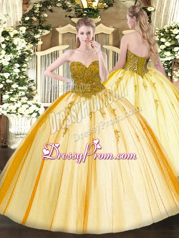 Neckline : SweetheartShown Color : GoldSilhouette : Ball GownsSleeve Length : sleevelessHemline : floor lengthBack Detail : Lace upFabric : TulleEmbellishment : BeadingOccasion : Military Ball,Sweet 16,QuinceaneraSeason : Spring,Summer,Fall,Winter