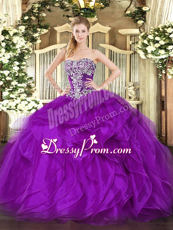 Neckline : StraplessShown Color : PurpleSilhouette : Ball GownsSleeve Length : sleevelessHemline : floor lengthBack Detail : Lace upFabric : OrganzaEmbellishment : Beading,RufflesOccasion : Military Ball,Sweet 16,QuinceaneraSeason : Spring,Summer,Fall,Winter