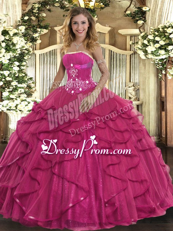 Neckline : StraplessShown Color : Hot PinkSilhouette : Ball GownsSleeve Length : sleevelessHemline : floor lengthBack Detail : ZipperFabric : TulleEmbellishment : Beading,RufflesOccasion : Military Ball,Sweet 16,QuinceaneraSeason : Spring,Summer,Fall,Winter