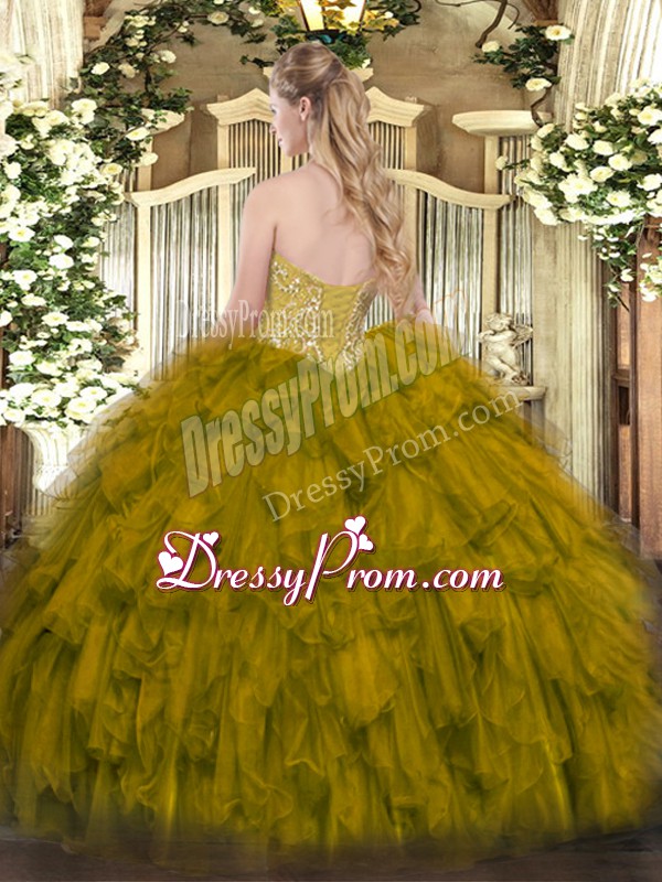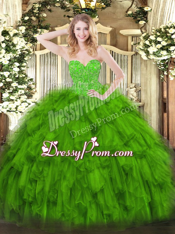 Neckline : SweetheartShown Color : GreenSilhouette : Ball GownsSleeve Length : sleevelessHemline : floor lengthBack Detail : Lace upFabric : OrganzaEmbellishment : Beading,RufflesOccasion : Military Ball,Sweet 16,QuinceaneraSeason : Spring,Summer,Fall,Winter