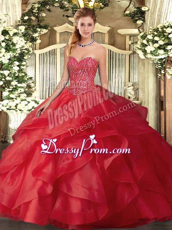 Neckline : SweetheartShown Color : RedSilhouette : Ball GownsSleeve Length : sleevelessHemline : floor lengthBack Detail : Lace upFabric : TulleEmbellishment : Beading,RufflesOccasion : Military Ball,Sweet 16,QuinceaneraSeason : Spring,Summer,Fall,Winter