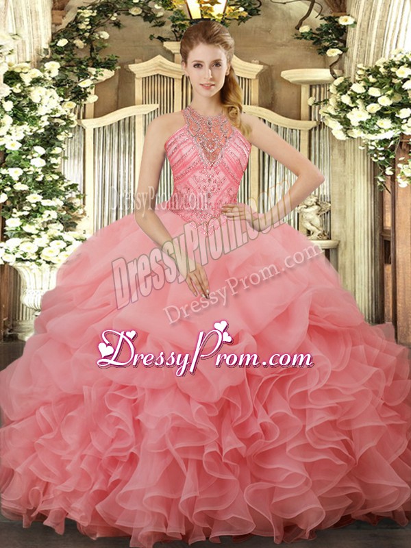 Neckline : Halter topShown Color : Watermelon RedSilhouette : Ball GownsSleeve Length : sleevelessHemline : floor lengthBack Detail : Lace upFabric : OrganzaEmbellishment : Beading,Ruffles,Pick UpsOccasion : Military Ball,Sweet 16,QuinceaneraSeason : Spring,Summer,Fall,Winter