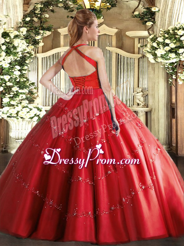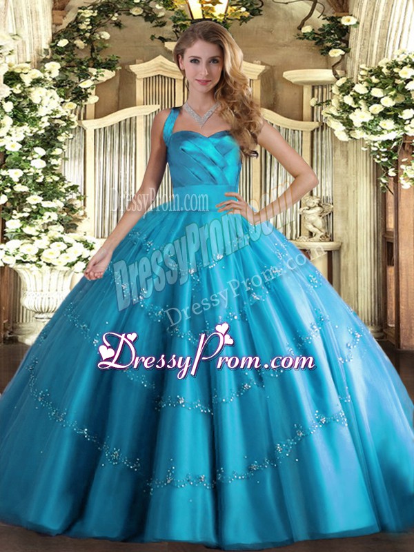 Neckline : Halter topShown Color : Baby BlueSilhouette : Ball GownsSleeve Length : sleevelessHemline : floor lengthBack Detail : Lace upFabric : TulleEmbellishment : AppliquesOccasion : Military Ball,Sweet 16,QuinceaneraSeason : Spring,Summer,Fall,Winter