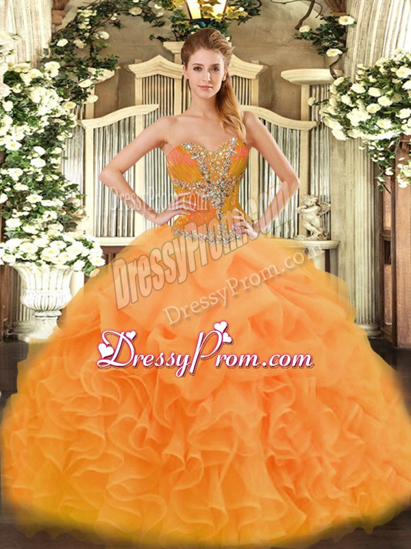 Neckline : SweetheartShown Color : OrangeSilhouette : Ball GownsSleeve Length : sleevelessHemline : floor lengthBack Detail : Lace upFabric : OrganzaEmbellishment : Beading,RufflesOccasion : Sweet 16,QuinceaneraSeason : Spring,Summer,Fall,Winter